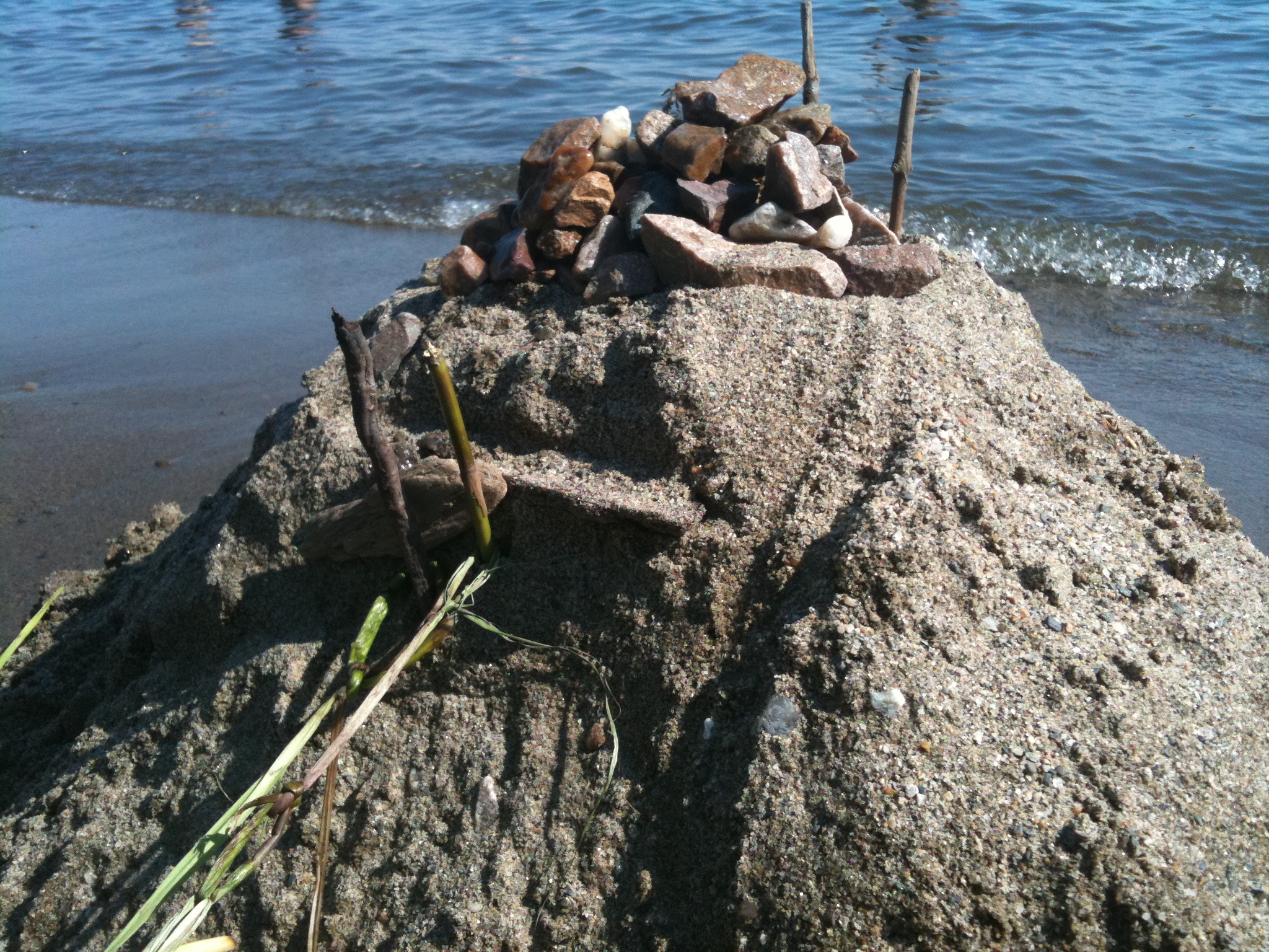 Massimo collected the sticks and stones, I provided the digging and the knot tie-ing. And some of the design. The inspiration was from Mother Nature and the beach itself.