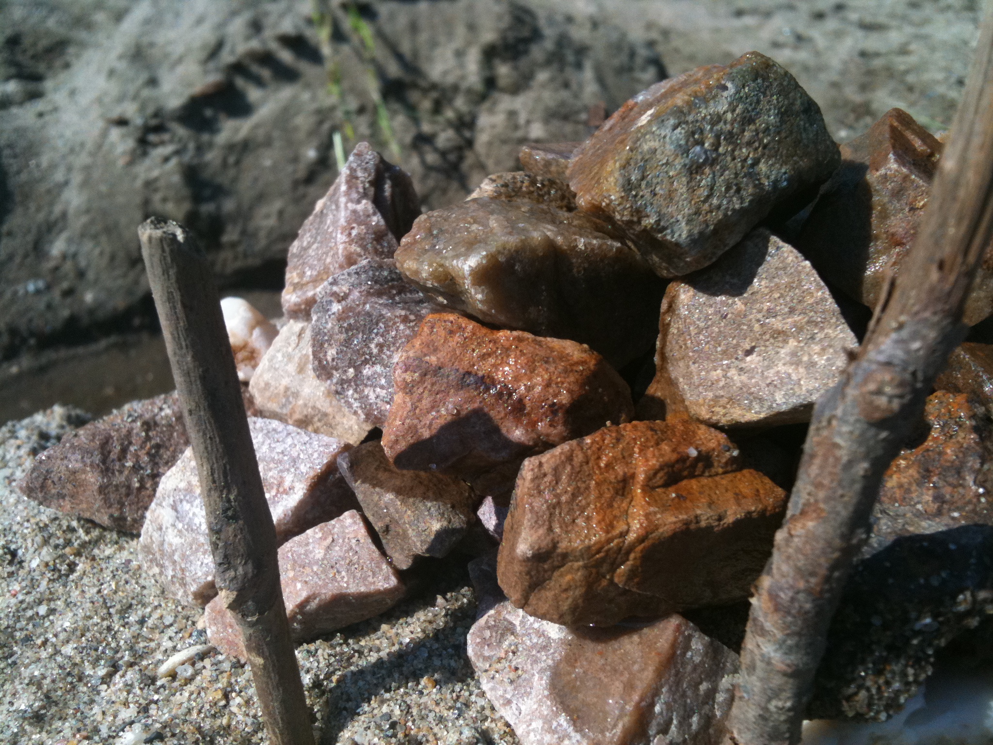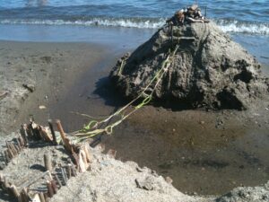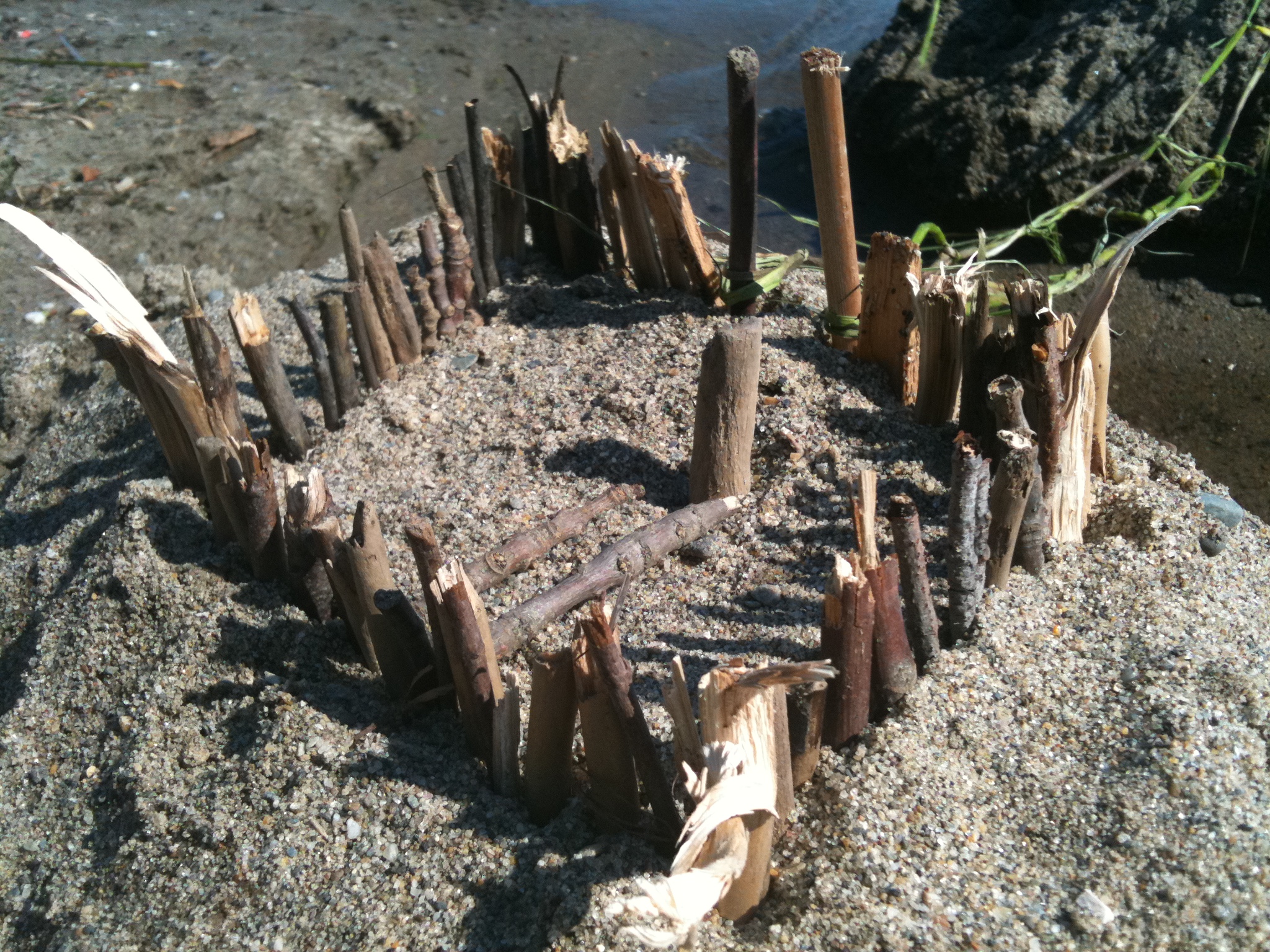 Massimo collected the sticks and stones, I provided the digging and the knot tie-ing. And some of the design. The inspiration was from Mother Nature and the beach itself.