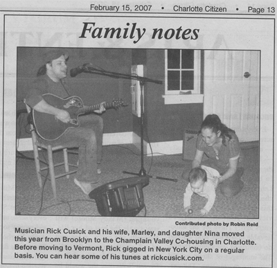On Sunday I was setting up a sign at the intersection of Route 7 and F-5 (Ferry Road) announcing the hours for our open house here at CVC, and I was hailed by a woman in a car pulling up to the light. She had seen my picture in the Charlotte Citizen from the open mic last weekend, and asked me if I was the guy who moved from Brooklyn. Yeah, I know I said I wasn’t going to play live for a while…but what can I do?